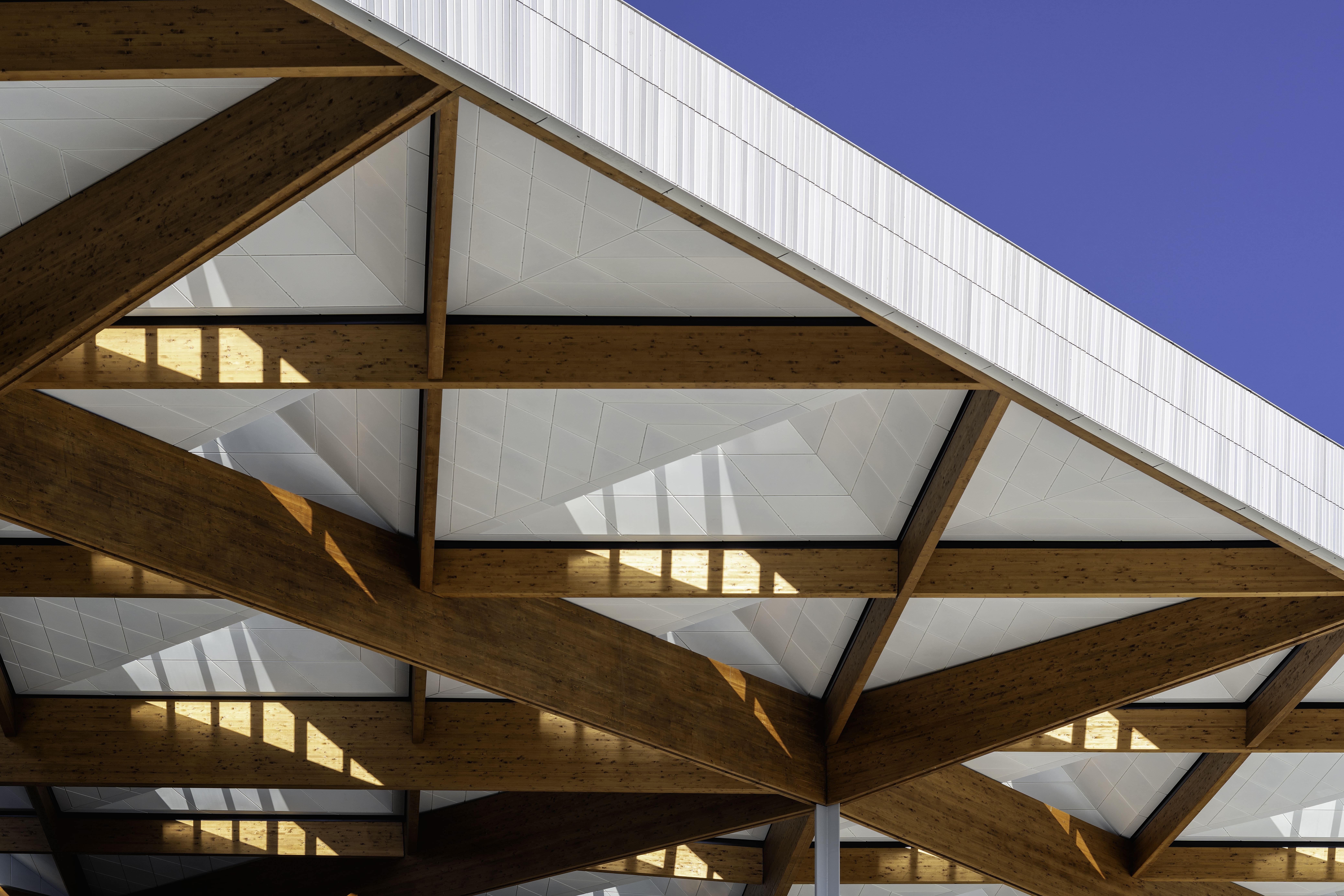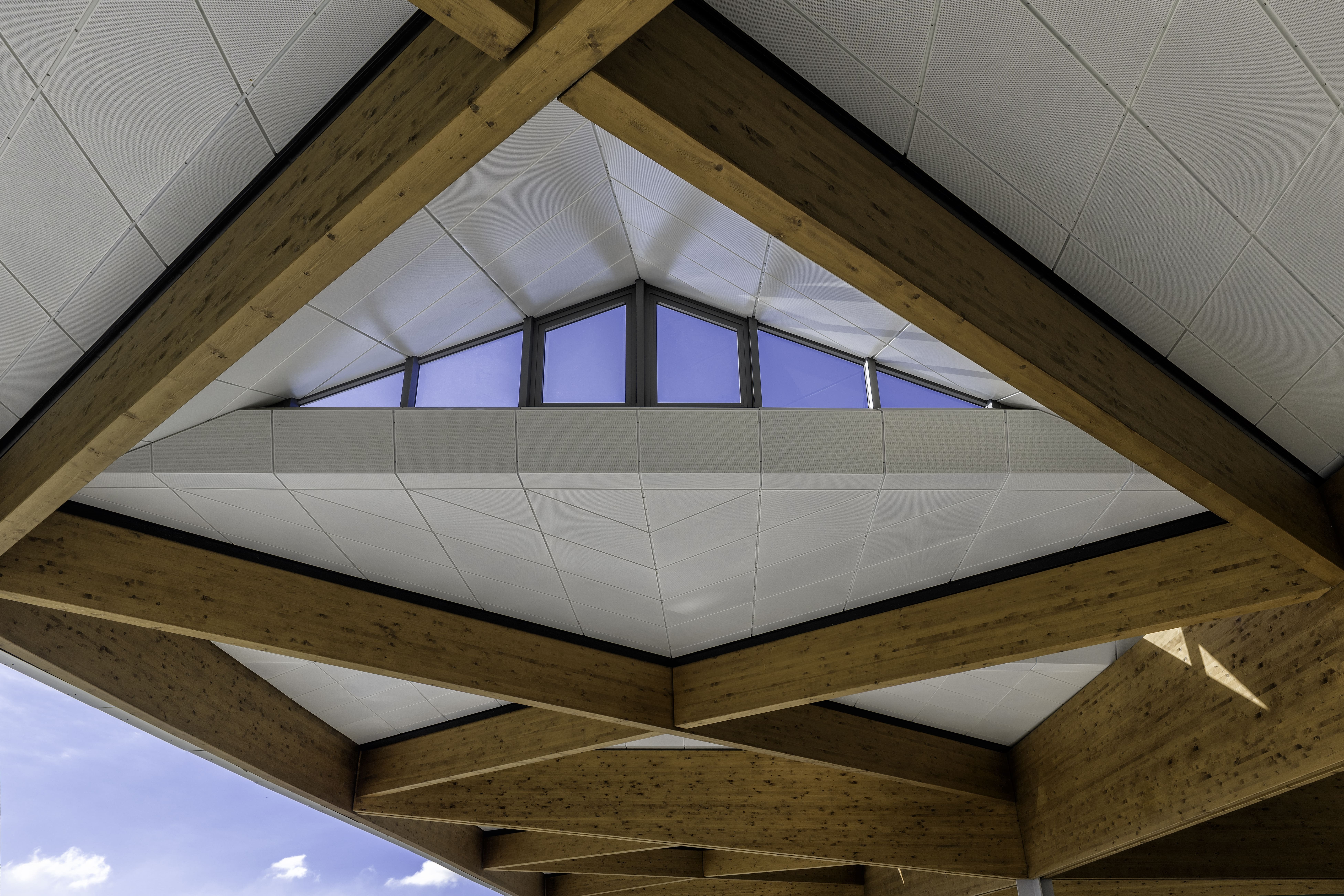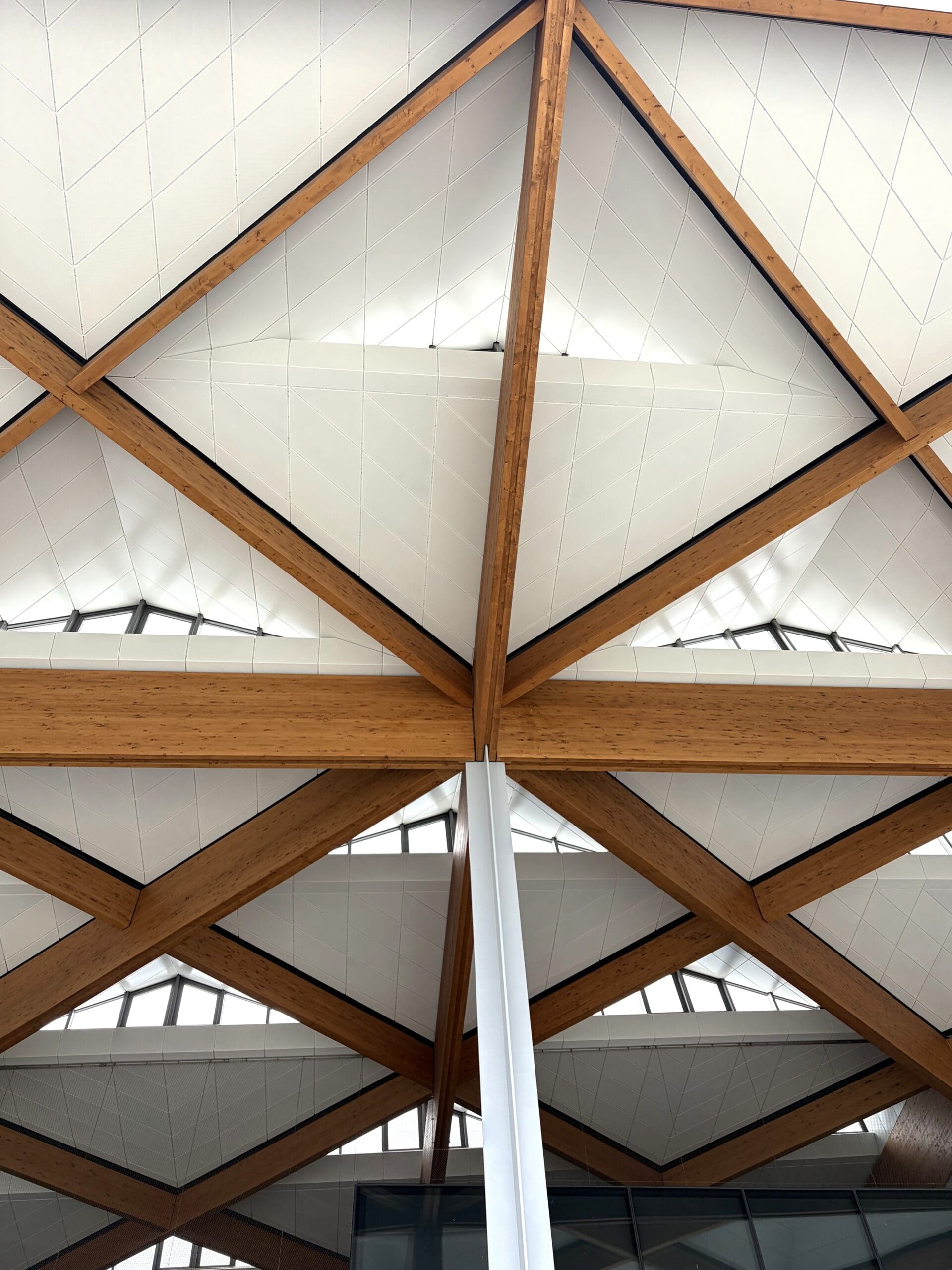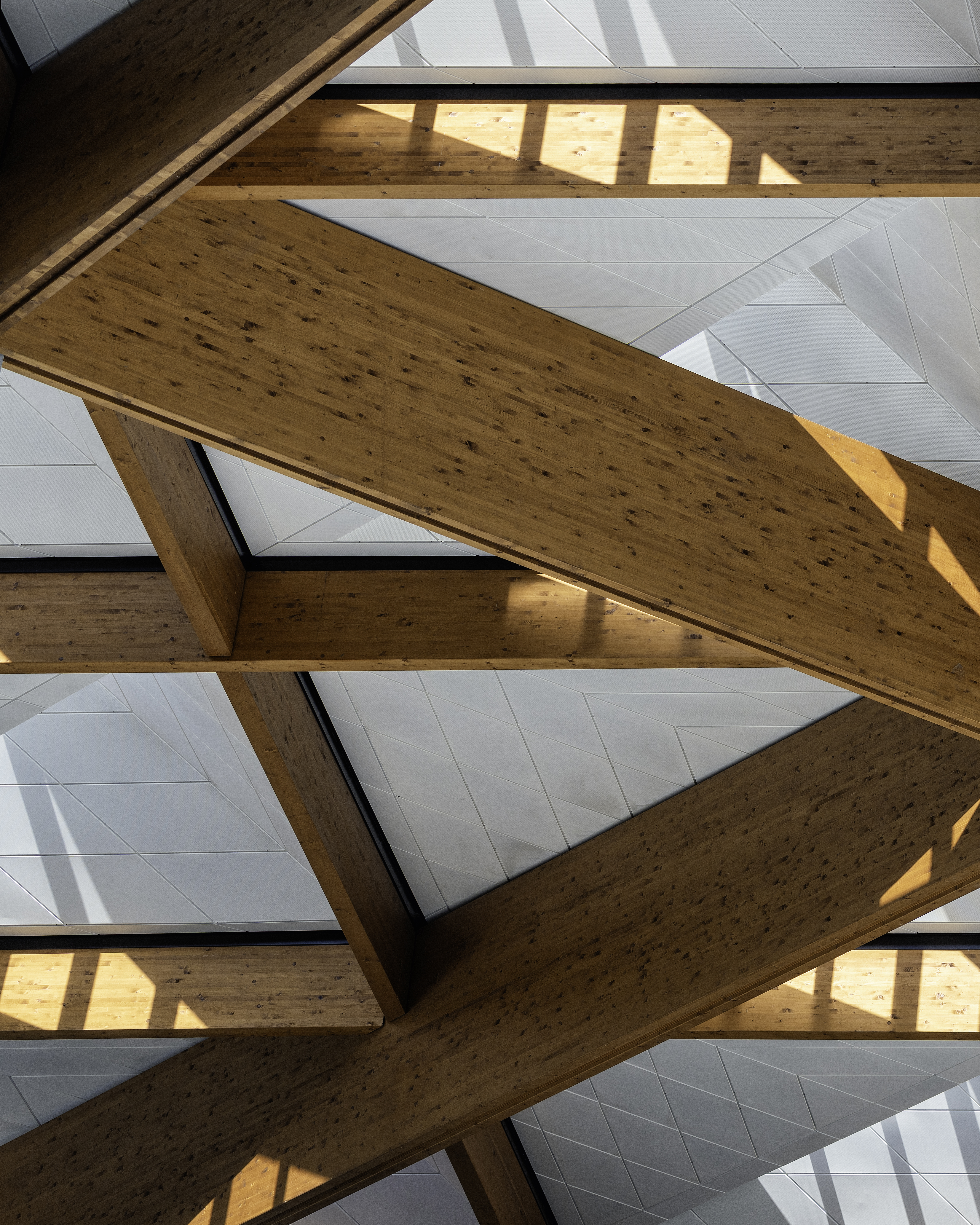 Early modelling identified that initial load assumptions would have resulted in oversized members and visually intrusive steel connection plates, undermining the architectural intent. Through iterative analysis and close collaboration with the wider design team, Northrop was able to challenge and refine these assumptions, achieving a solution that satisfied structural performance requirements while maintaining the clarity and elegance of the timber geometry.