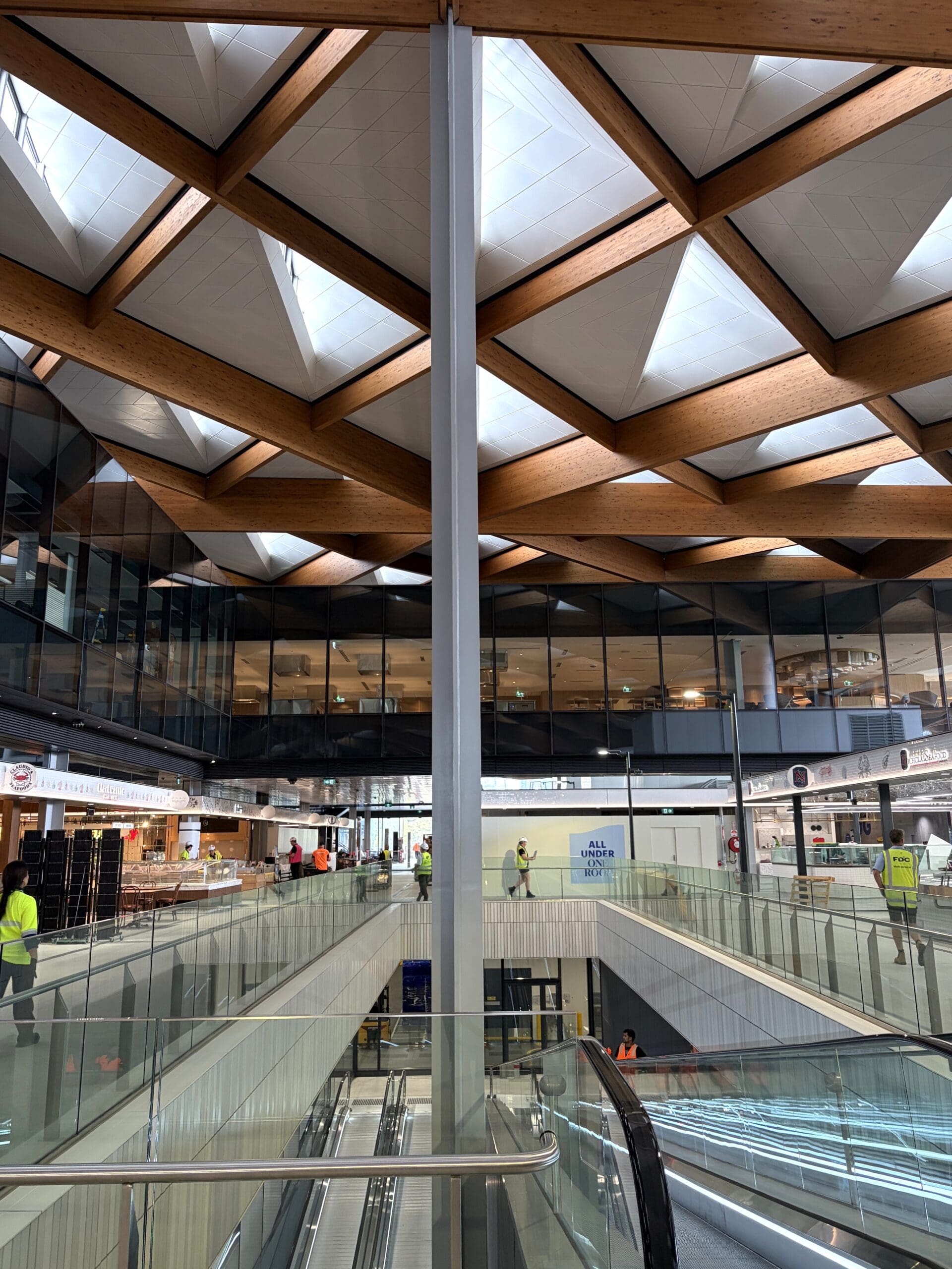 The roof structure spans up to 28 metres, with cantilevers of approximately nine metres, and is formed by a repeating system of timber members converging at complex nodes. In some locations, up to eight individual timber members meet at a single connection, creating significant structural, geometric and constructability challenges.