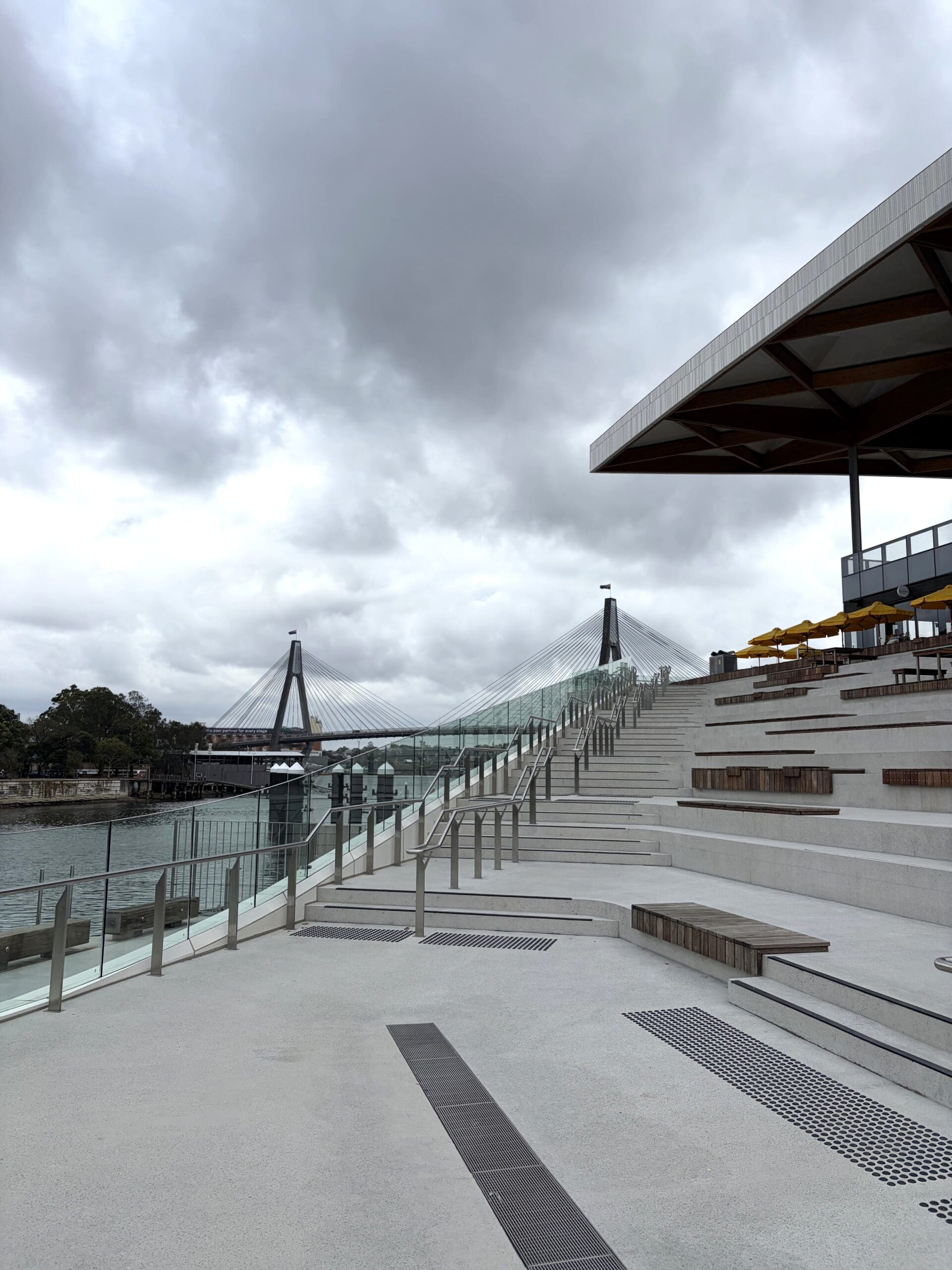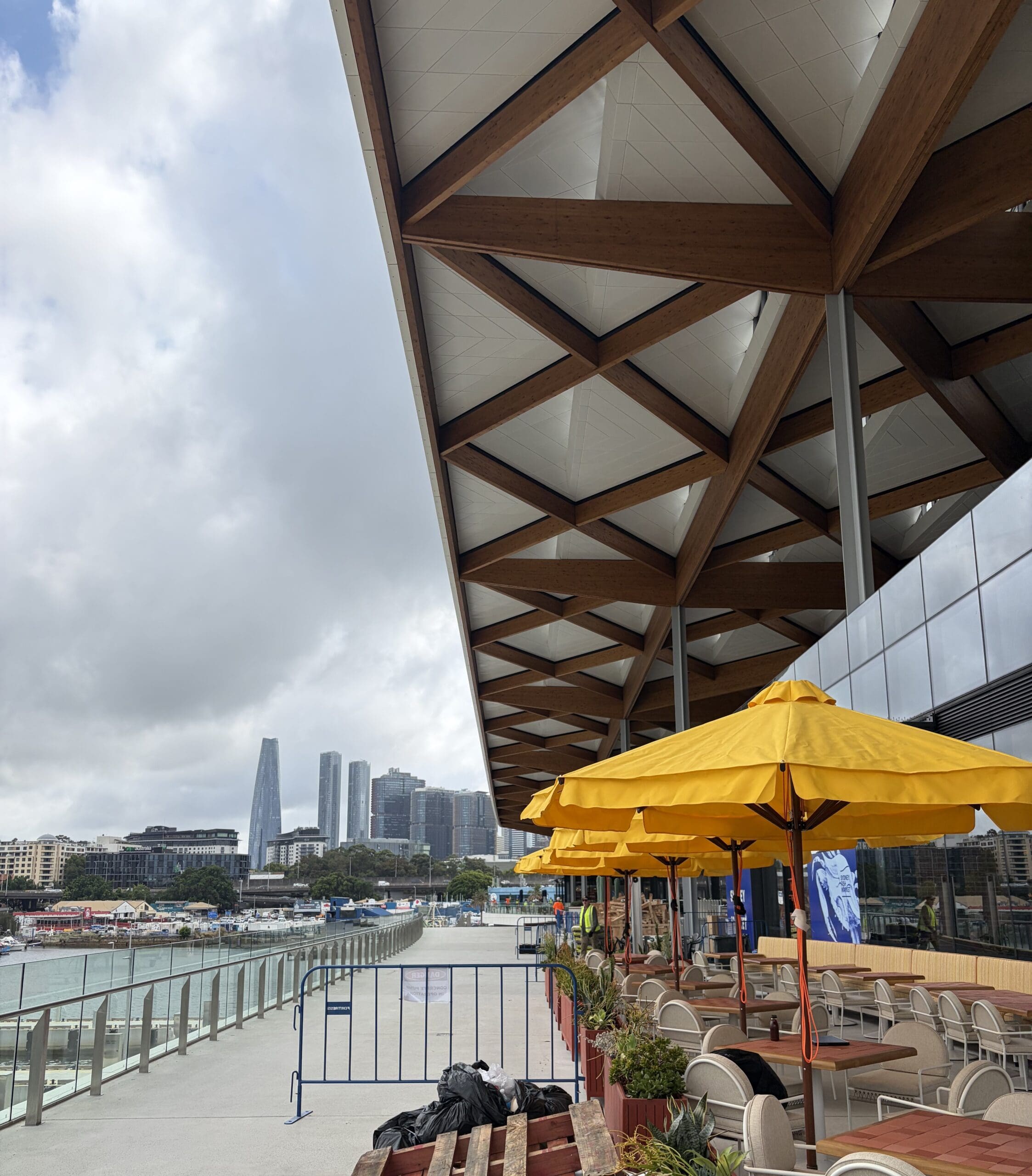 The timber roof spans up to 28 metres, with additional cantilevers of approximately 9 metres, and is formed by large timber members converging at sculpted nodes. In several locations, up to eight members connect at a single node, creating significant structural and constructability challenges. Located immediately adjacent to Sydney Harbour, the roof is exposed to strong winds and a marine environment, requiring careful consideration of durability and long-term performance.