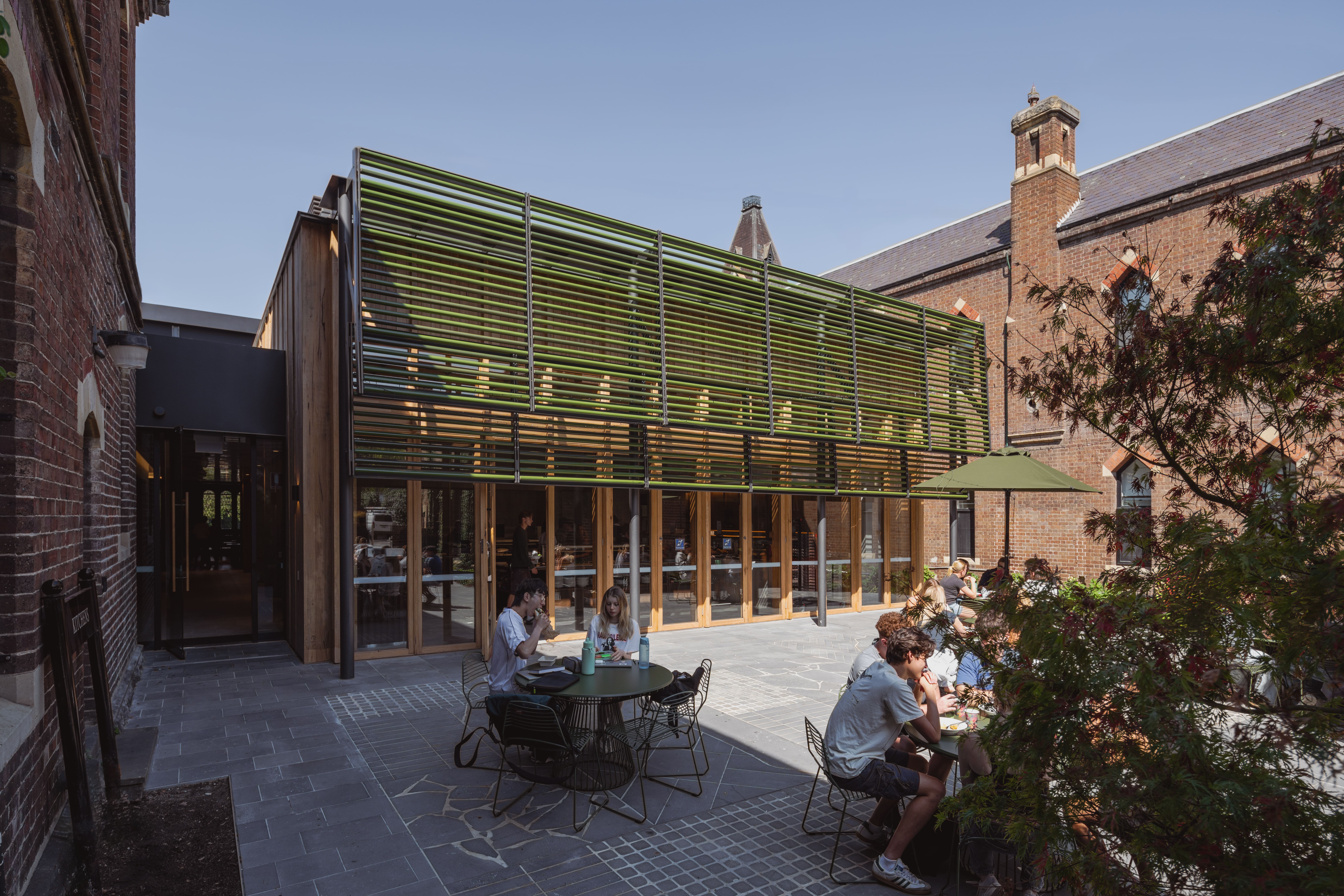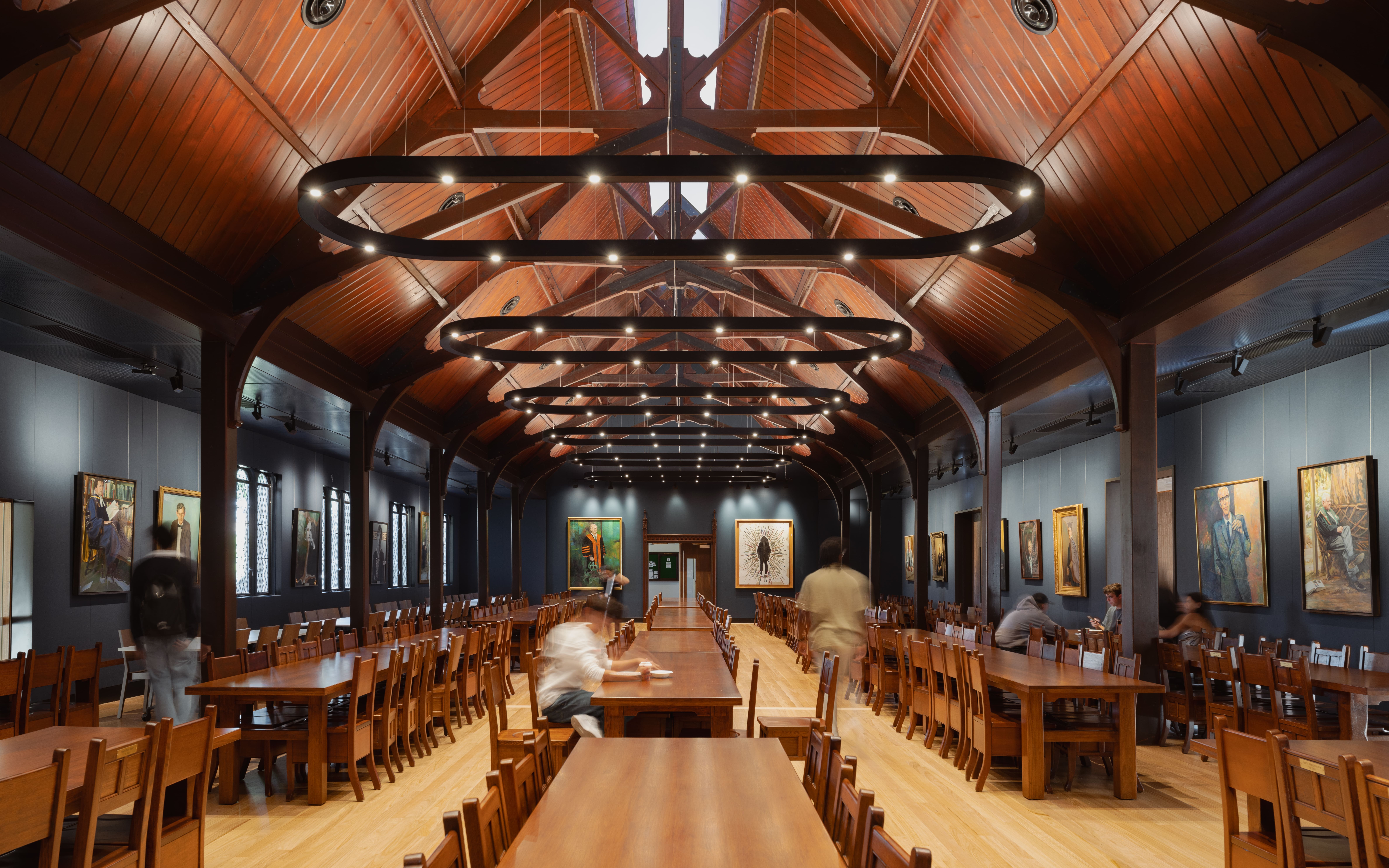 For Stage 2, The Kitchens Precinct, mass timber was used to create a welcoming dining and kitchen facility for the students, with a full commercial kitchen being carefully located below ground, resulting in significant structural challenges to protect the adjacent heritage buildings. The project being topped off with an extension to the existing heritage dining hall, carefully restored to match the original construction.