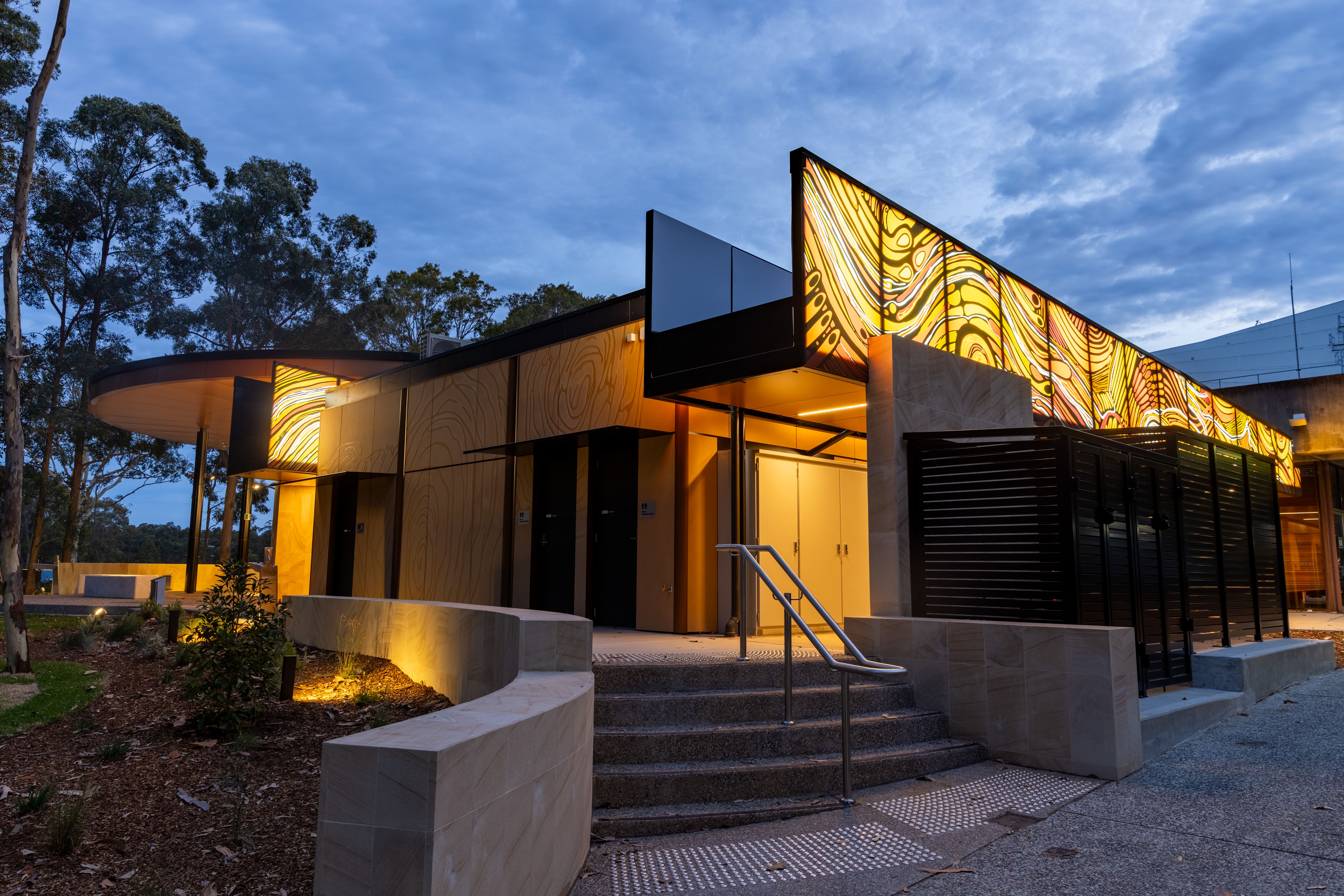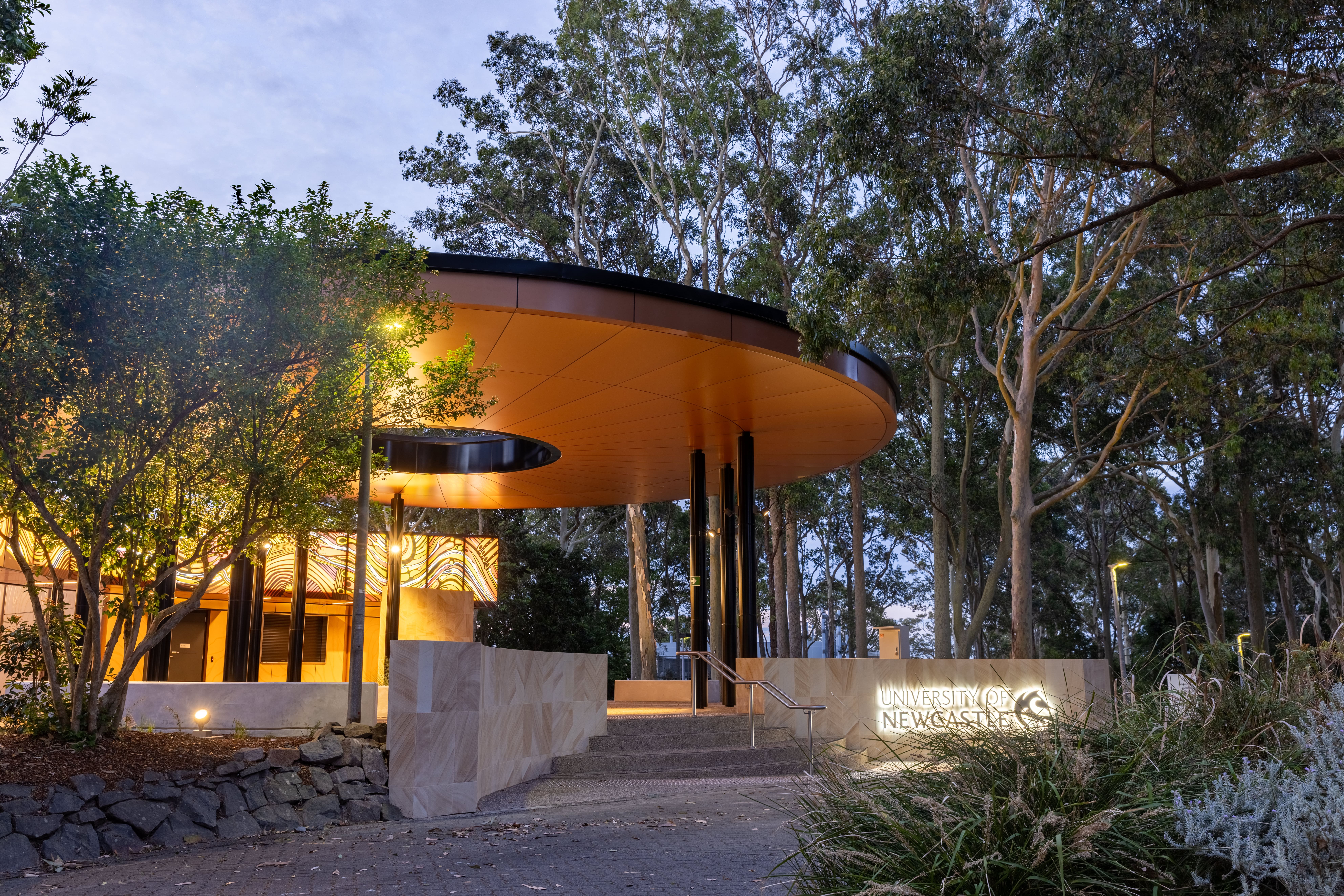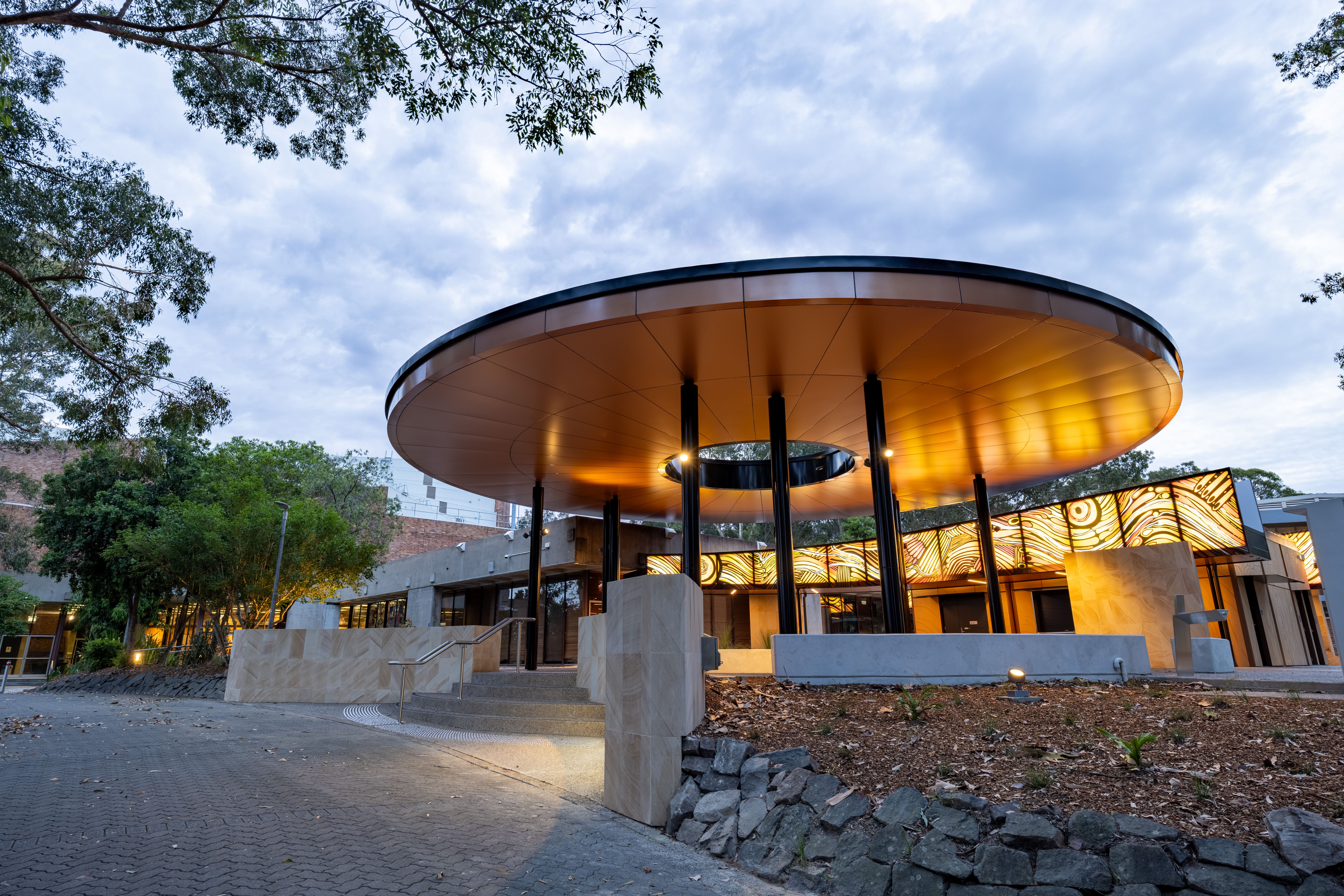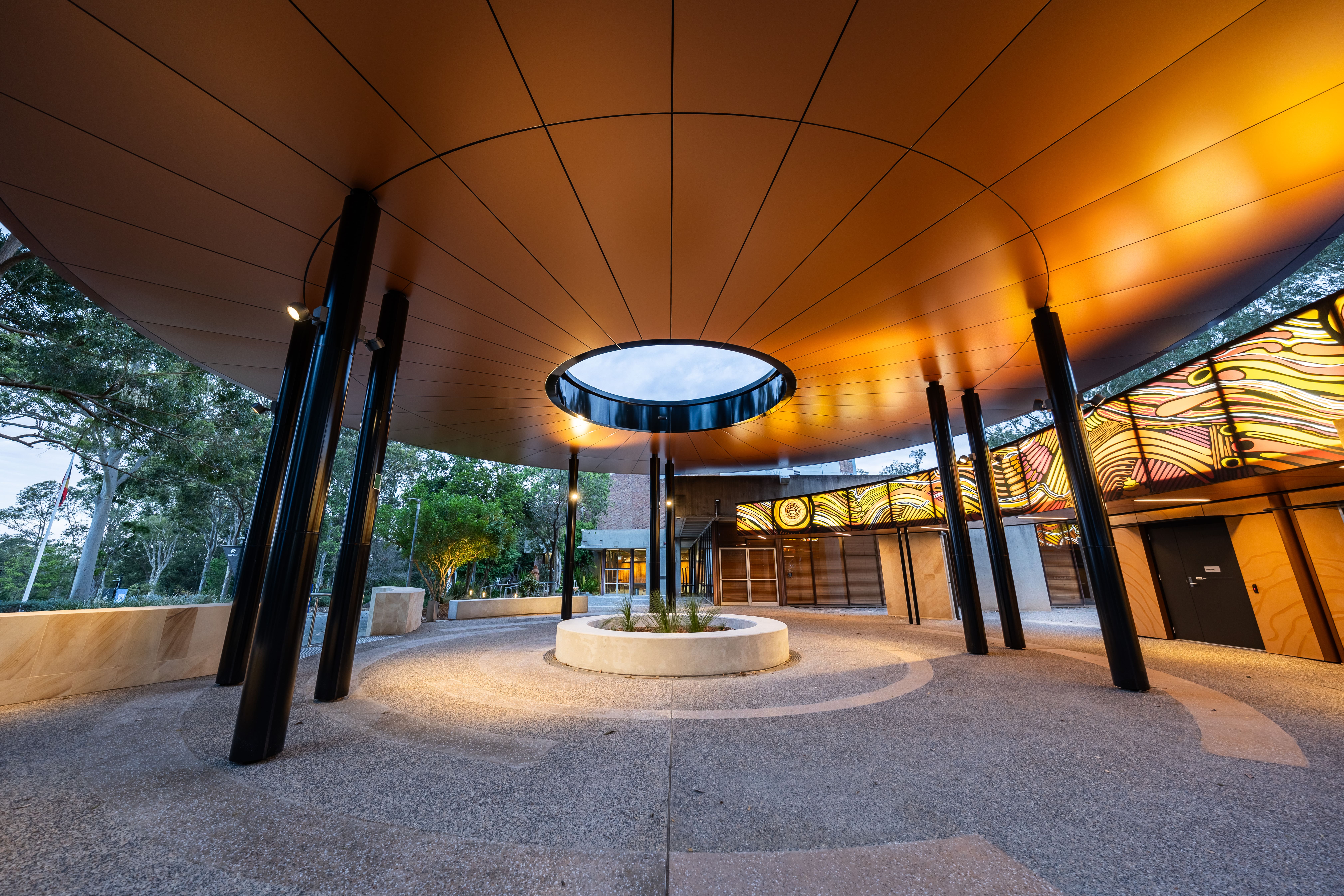 In response to the University’s interest in modular construction, we worked closely with the design and construction team to identify where this approach could deliver the greatest value. The curved, sweeping awnings, incorporating Indigenous artwork, were constructed in modules, enabling high-quality finishes, faster construction and minimal disruption to the surrounding precinct. This approach also allowed the design team to create the visual effect of floating awnings, achieved through carefully engineered structural solutions with minimal supports.